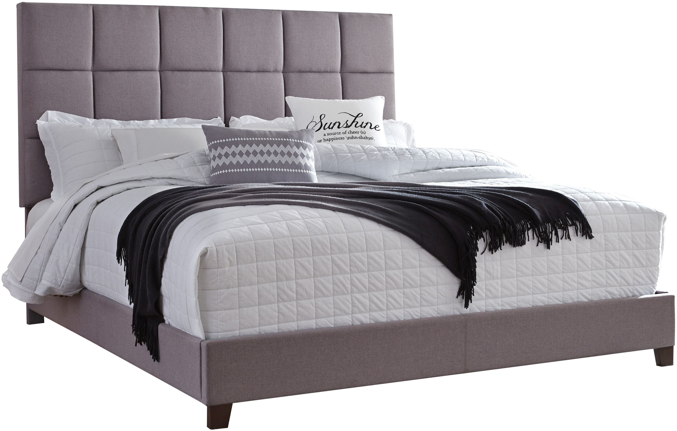 This king upholstered bed is sure to awaken a love for modern platform styling with a softer side. Plush to the touch and so easy on the eyes, a dusty gray fabric hugs the bed, from the chic headboard with stitched square tufting, to the low footboard and side rails.Read More